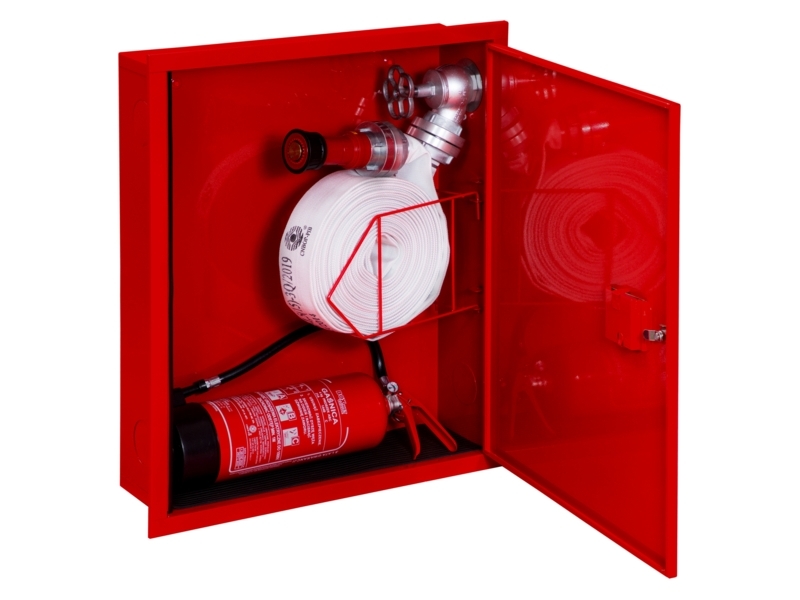 Hydrant wewnętrzny DN52 z miejscem na gaśnicę pod spodem, z wężem płaskoskładanym DN52 20 metrów w koszu, w szafce wnękowej, z zaworem DN52 oraz prądownicą mosiężną płynnie regulowaną między prądem zwartym a rozproszonym. Istnieje możliwość dopasowania produktu do potrzeb klienta.