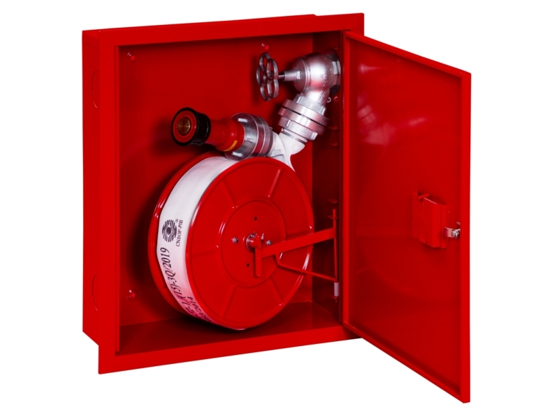 Hydrant wewnętrzny DN52 bez miejsca na gaśnicę, z wężem płaskoskładanym DN52 15 metrów na bębnie, w szafce wnękowej, z zaworem DN52 oraz prądownicą mosiężną płynnie regulowaną między prądem zwartym a rozproszonym. Istnieje możliwość dopasowania produktu do potrzeb klienta.