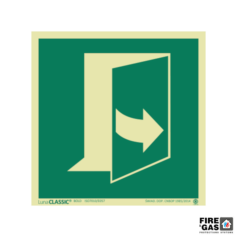 Znak bezpieczeństwa Ciągnąc aby otworzyć drzwi prawe E057 15x15 to jeden ze znaków ewakuacyjnych, który służy do oznaczenia drzwi ewakuacyjnych. Ów znak pozwala na poinformowanie osoby zbliżającej się do drzwi ewakuacyjnych, że drzwi trzeba ciągnąć z lewej strony aby otworzyć. Znak E057 Ciągnąć aby otworzyć drzwi (prawe) jest wielkości 150x150 mm i wykonano go w technologii zapewniającej jego dobre widzenia także po zgaśnięciu świateł – ewakuacyjny znak E057 Ciągnąć aby otworzyć drzwi prawe to znak fotoluminescencyjny (świeci się w nocy). Znak E057 15x15 wykonano na sztywnej płycie, która zapewnia wytrzymałość znaku i pozwala na łatwe zamocowanie znaku na drzwiach. Dodatkowo aby ułatwić montaż znaku wyposażono go w przylepce umożliwiające szybkie przyklejenie.