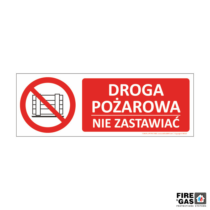 Znak przeciwpożarowy Droga pożarowa Nie zastawiać 70x25 T246 to jeden ze znaków wskazujących miejsce, w którym jest droga pożarowa i informujący, iż należy pozostawić na niej przejazd (nie zastawiać przejazdu w wyznaczonym miejscu) dla pojazdów ratunkowych, w tym dla jednostek straży pożarnej. Znak ten odgrywa duże znaczenie w momencie powstania pożaru. Znak ppoż. T246 ma formę prostokąta z napisem „DROGA POŻAROWA NIE ZASTAWIAĆ” z prawej strony i bramą w przekreślonym kole z lewej strony. Znak T246 Droga pożarowa Nie zastawiać 70x25 został wykonany z polipropylenu kanalikowego o rozmiarze 700x250 mm. Materiał ten odznacza się lekkością, ma dobrą sztywność, jest odporny na warunki atmosferyczne, a także promieniowanie UV oraz odporny na wodę, co sprawia, że może być stosowany w tworzeniu znaków mocowanych na zewnątrz budynku. Znak bezpieczeństwa Droga pożarowa Nie zastawiać 70x25 cm T246 ma dodane nacięcia pod otwory montażowe, co usprawnia zamocowanie znaku przy wykorzystaniu opasek zaciskowych.