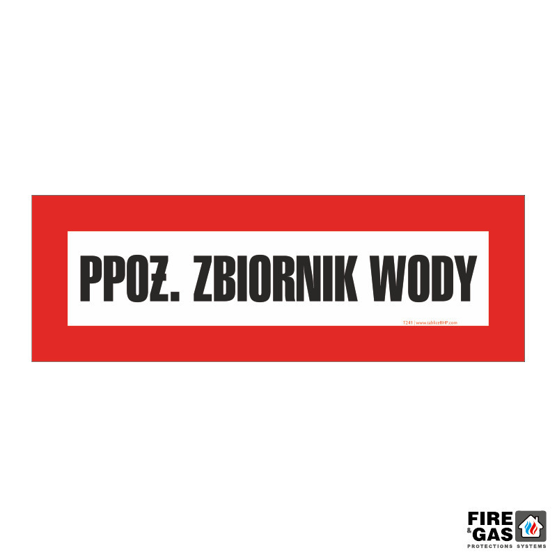 Znak Ppoż. zbiornik wody 68x23 T241 jako jeden ze znaków uzupełniających ochrony przeciwpożarowej pozwala na oznaczenie przeciwpożarowego zbiornika wody – znak ten umieszcza się w pobliżu wydzielonego przeciwpożarowego zbiornika wody. Znak Przeciwpożarowy zbiornik wody ma formę podłużnej tabliczki wykonanej z polipropylenu kanalikowego – jest to materiał lekki, odporny na wodę i warunki atmosferyczne przez co doskonale sprawdza się na zewnątrz obiektów, jak i w ich środku. Znak T241 Ppoż. zbiornik wody ma rozmiar 680x230 mm – na białym tle umieszczono napis „PPOŻ. ZBIORNIK WODY” – dookoła napisu znajduje się czerwone obramowanie przykuwające wzrok osoby patrzącej w stronę znaku, co pozwala na szybsze odnalezienie znaku przeciwpożarowego uzupełniającego. Znak T241 Ppoż. zbiornik wody 23x68 można mocować za pomocą opasek zaciskowych.