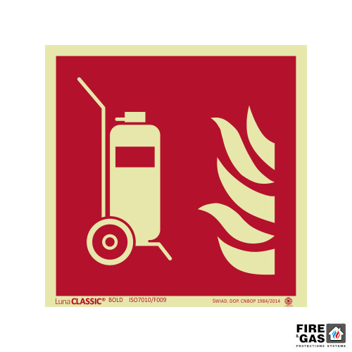 Znak Wózek gaśniczy 15x15 F009 służy do oznaczania wózka gaśniczego, którym jest np. gaśnica przewoźna 25 kg, agregat gaśniczy. Znak Wózek gaśniczy (znak gaśnica przewoźna / znak agregat gaśniczy) jest znakiem należącym do grupy znaków przeciwpożarowych, z tego też względu posiada tło w kolorze czerwonym. Na znaku F009 Wózek gaśniczy 15x15 widnieje piktogram przestawiający płomienie i gaśnicę przewoźną znajdującą się na wózku – wózek ułatwia przemieszczanie gaśnic o znacznej wadze, co pozwala na łatwiejsze i szybsze ugaszenie pożaru w przypadku jego wybuchu. Znak Wózek gaśniczy F009 jest sztywnym znakiem w formie tabliczki fotoluminescencyjnej, dzięki czemu znak F009 świeci w ciemności (emituje pochłonięte światło). Znak Wózek gaśniczy F009 ma 150x150 mm wielkości. Kupując znak Wózek gaśniczy F009 15x15 otrzymujemy tabliczkę gotową do przyklejenia – z tyłu znaku umieszczono elementy klejące pozwalające na zamocowanie tabliczki.